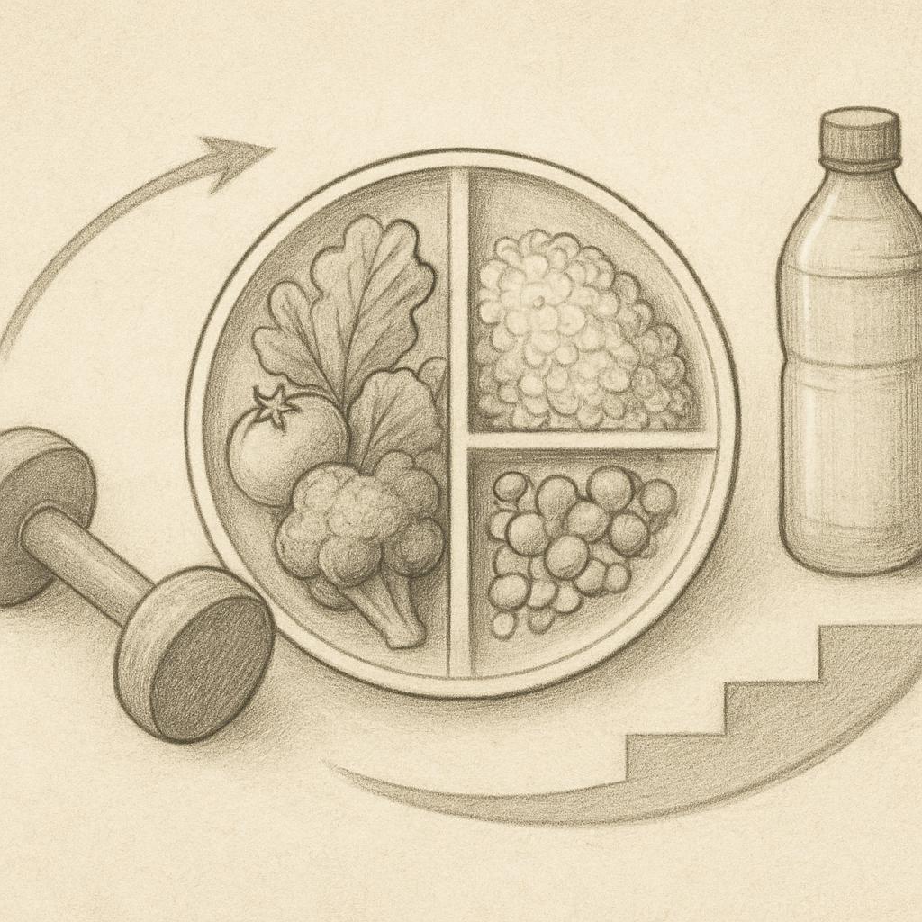 단백질을 충분히 섭취하고 채소를 충분히 포함한 식단이 도움이 됩니다. 탄수화물은 활동량에 맞춰 조절하고, 물 섭취와 규칙적인 수면도 함께 관리합니다. 식사 시간과 간식의 간격을 일정하게 유지하면 배고픔이 덜 느껴지며 과식 위험이 낮아집니다.